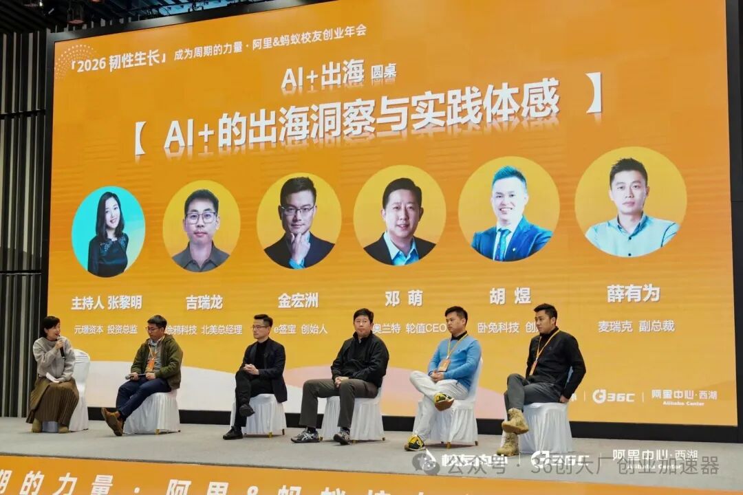 AI+出海圆桌论坛聚焦“AI+的出海洞察与实践体感”,由元璟资本黎明主持,涂鸦科技北美总经理吉瑞龙、e签宝创始人金宏洲、米奥兰特轮值CEO邓萌、卧兔科技创始人胡煜、麦瑞克副总裁薛有为共同讨论。