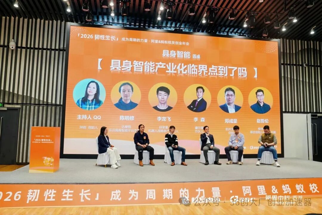 具身智能圆桌以“具身智能产业化临界点到了吗?”为议题,由36创QQ主持,达摩院具身智能实验室陈明修、自变量机器人李龙飞、睿尔曼科技合伙人李森、艾铂特创始人邓成呈、维他动力联合创始人兼产品总裁赵哲伦共同讨论。