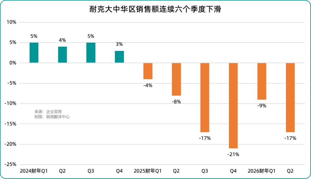 然而,中国市场的表现却形成了鲜明对比。耐克大中华区Q2收入同比下滑17%,降至14.2亿美元(约合人民币98.6亿元),连续六个季度负增长;其中,作为核心品类的鞋类跌幅高达21%。考虑到中国市场约占耐克年收入的15%,这一趋势已从短期波动演变为对整体增长结构的持续拖累。