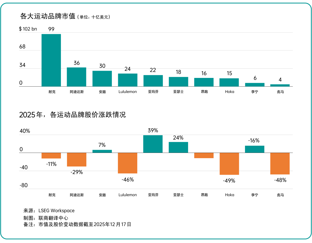 这种分化同样反映在资本市场上。2025年以来,耐克、阿迪达斯股价整体承压,而以中国和亚洲市场为重要增长来源的品牌表现明显跑赢。