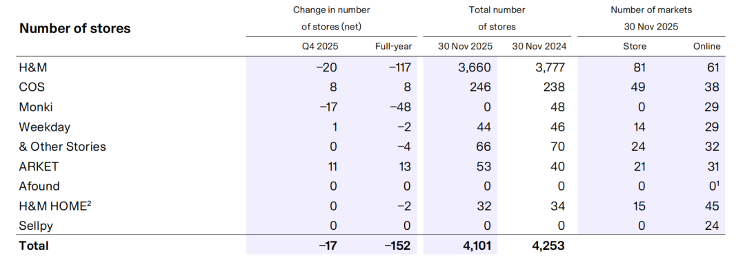 从门店数量看,H&M集团2025年全年关闭152家门店,其中包括中国市场在内的亚洲、大洋洲和非洲市场区域关闭105家门店。从品牌角度,关闭门店主要集中在H&M品牌,2025年共关闭117家。