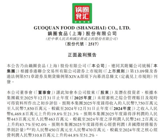公告显示,截至2025年12月31日,锅圈预计实现收入77.5亿元至78.5亿元,同比增长19.8%至21.3%;净利润预计4.43亿元至4.63亿元,同比增长83.7%至92%;核心经营利润预计4.5亿元至4.7亿元,同比增长44.8%至51.2%。