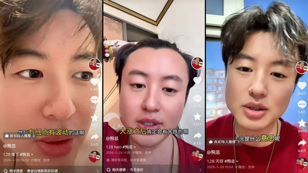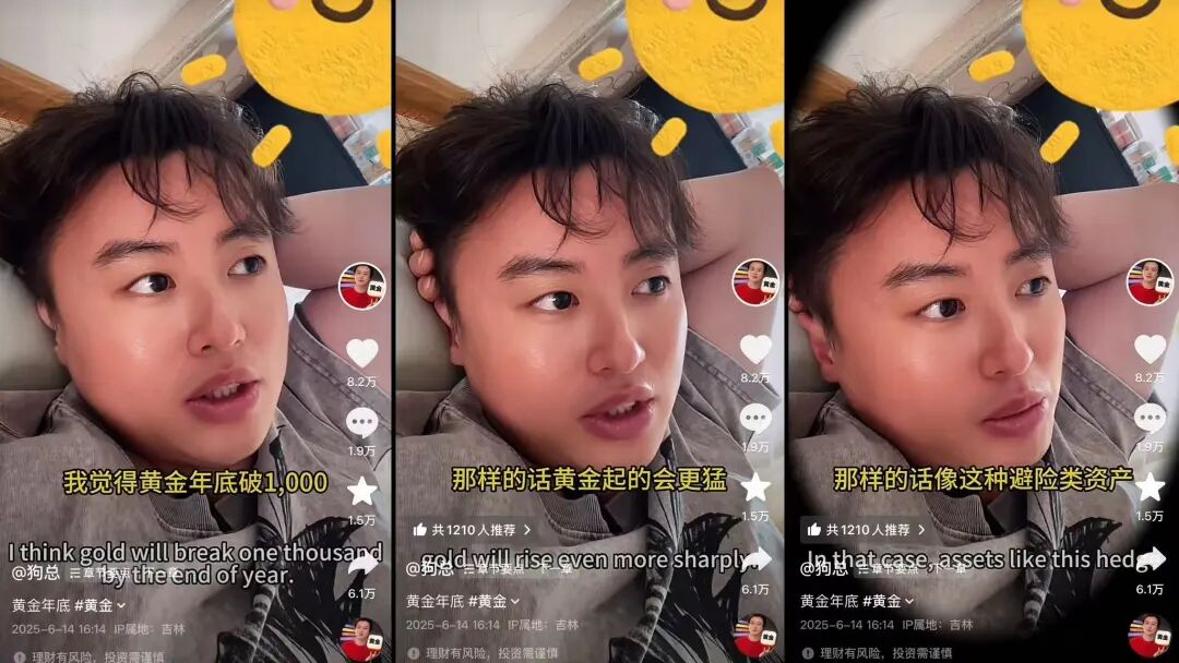 2025年6月,抖音财经博主@狗总 发视频劝用户买黄金,称年底破1000没问题,还从经济政治环境分析避险资产上升空间。半年后金价上涨印证猜测,@狗总 受更多关注。