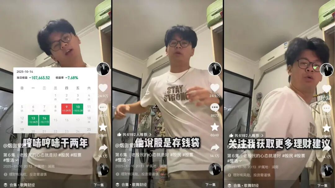 @烟囱爱跳舞 2023年10月开始发跳舞视频,后期加杂谈分享生活感悟,但上百条作品后账号仍不温不火。2025年10月发布《老股民的心态就是好》短视频,晒爸爸股票收益率截图,配合BGM卡点跳舞,哼唱原创歌词:“给你们看我老爸,他最勤俭持家,嫌自己压力不够大,在大A里面玩梭哈,哼哧哼哧干两年,两天全部白搭,我说两天亏一辆车,难道你不怕吗,他说股是存钱袋,有人帮你存起来,哎,留着还能传宗接代,等你取出来,哎,老股民的心态啊,我感觉到父爱了,这才叫做做长线,一股传三代呀。”视频获赞24.9万、转发14.1万,他由此开拓“歌舞财经”路线。