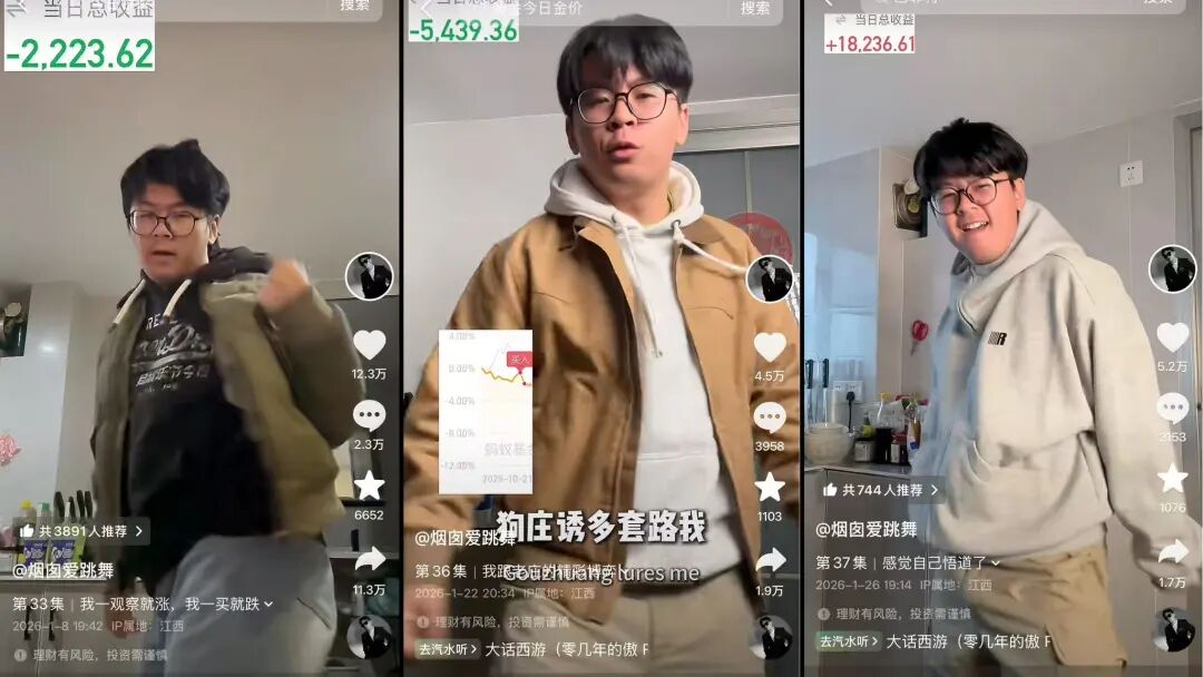 他将严肃财经话题、理财成绩、股民痛点与魔性舞蹈、自嘲歌词结合,输出精准描绘股民心态、兼具趣味与代入感的内容,满足用户娱乐需求,提供价值与情感慰藉,收获关注。截至目前,《歌舞财经》系列更新至37集,总播放1.9亿,抖音粉丝从几万涨至42.5万,B站粉丝26.3万。