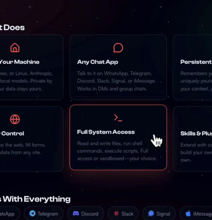 它可在本地Mac或服务器上运行,以用户熟悉的聊天软件(如Slack、Teams、iMessage或Telegram)作为交互入口,能直接操控本地文件、终端乃至浏览器。