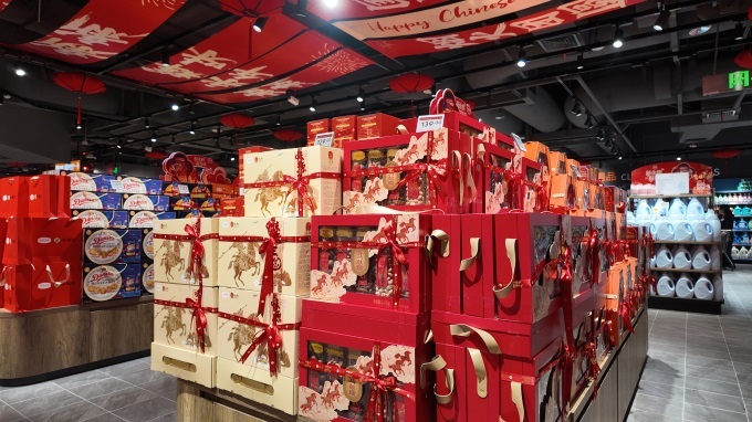 佳节赠礼也是重点,今年永辉推出约150款新年礼盒,新品率超70%,涵盖水果、坚果、糖巧、糕点等品类,匹配多元赠礼与自用需求。正佳广场店将官栈港式花胶羹礼盒、永辉定制&油趣工坊有机山茶油礼盒、永辉定制×三只松鼠招财桶礼盒等置于醒目位置,满足从社交到家用的全维度需求。