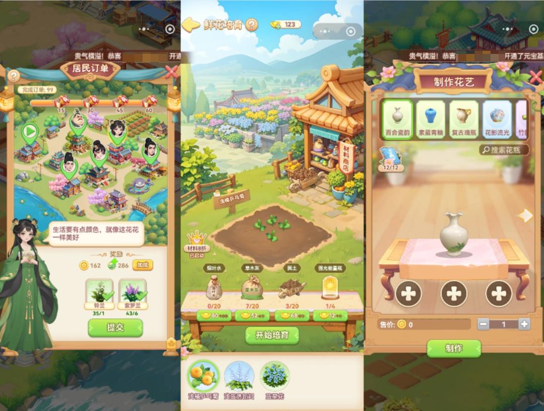 完成种花流程后,玩家可以进入花卉系统(培育、升级、插花)、经济系统(订单委托、花艺售卖)等常见的经营模块。此外,游戏内还设有迷你游戏模块,包含Merge3小游戏。