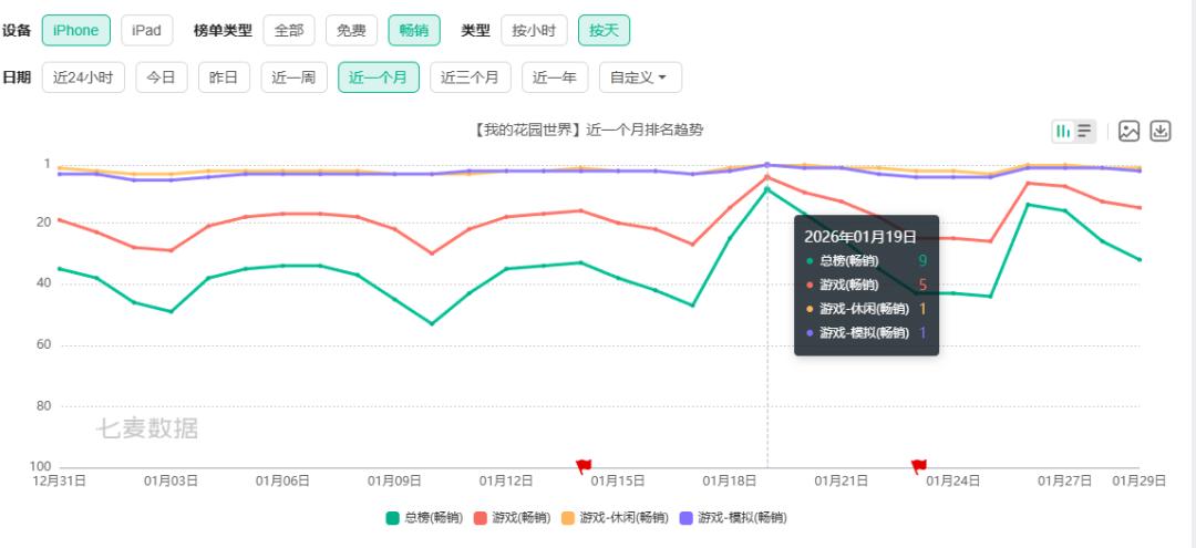 《我的花园世界》是一款模拟经营游戏,于2025年8月5日上线,之后成绩一路上升,iOS畅销榜排名稳定在30名左右,最高达到畅销榜Top5。