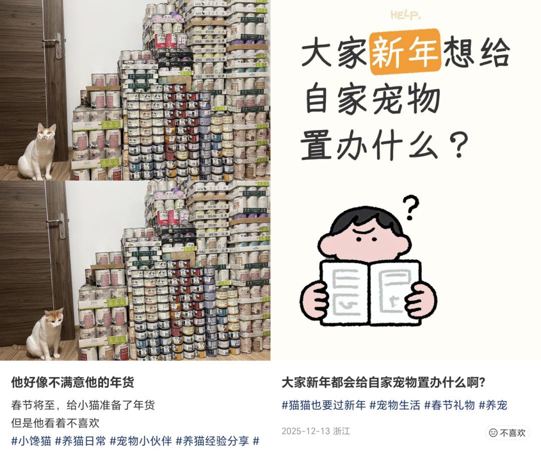 天猫数据显示,近期宠物新年相关新品数量同比增长近60%,“宠物过年衣服”“宠物年夜饭”等热词搜索频次明显上升。除了占比最高的食物和服装,宠物车载垫、小宠外带箱等携宠回家商品,也成了养宠人争相置办的“年货”。