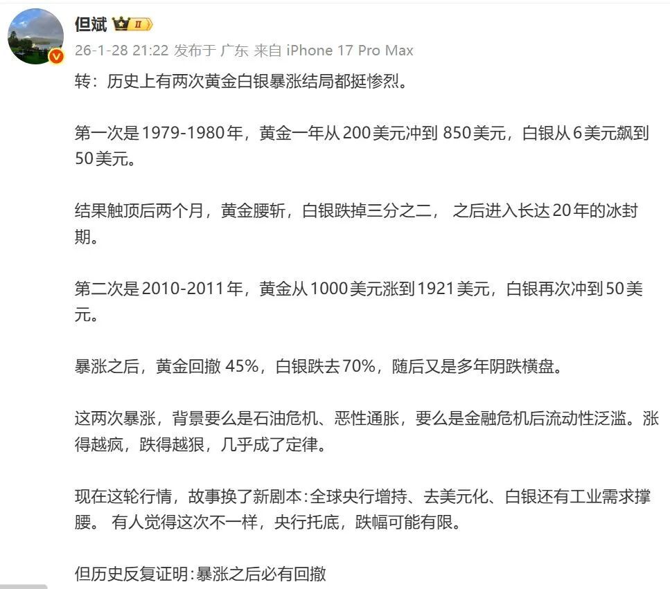 1月28日晚间,私募大佬但斌在个人微博转发了看空黄金的言论,引发网友热议,有网友评论称其“吃不上葡萄说葡萄酸”。
