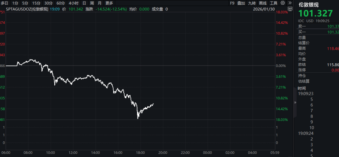 伦敦银现价格盘中最大跌幅超过18%,不仅跌破了100美元/盎司的关口,最低时甚至下探至95美元/盎司以下。而就在前一个交易日,伦敦银现的最高价格还曾攀升至120美元/盎司以上,价格波动幅度之大令人咋舌。