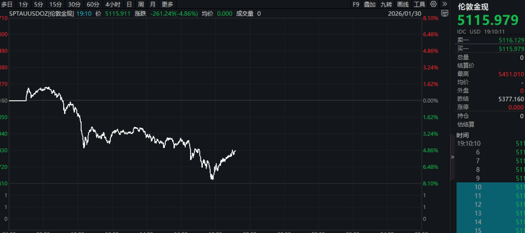 在白银价格大跌的带动下,其他贵金属品种也未能幸免。伦敦金现价格盘中跌幅一度超过8%,最低跌破5000美元/盎司;上一交易日其最高价格还接近5600美元/盎司。