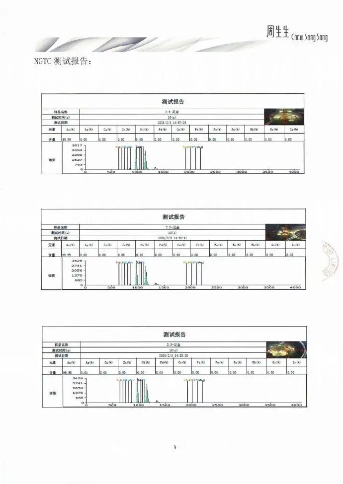 与此同时,在2月3日当天,周生生已经将同批次同款的福袋送至国家珠宝玉石首饰检验集团有限公司(NGTC)进行检测,检测采用的是X射线荧光谱法(XRF),该福袋货品的检测结论为足金饰品(报告编号:P-ZSSA2121621)。NGTC对该货品随机选取了3个检测点,检测得出的金含量结果分别为99.99%、99.99%、99.98%。