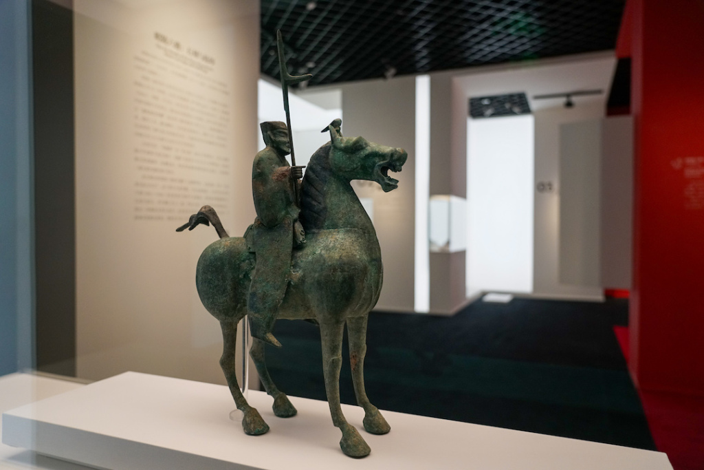 《寻马记》首站落于上海博物馆人民广场馆,立春当日,这里开启了年度生肖迎春展——“春风骐骥:马年生肖展”。展品跨越汉至近现代两千余年,既有彰显汉代车骑仪仗威严的铜车马、踏云凌空的玉雕天马、唐代栩栩如生的骑马击鼓俑,也有徐悲鸿、张大千等现代名家笔下的马……16件/组马主题文物姿态各异,呈现马文化丰富多元的内涵与蓬勃向上的象征意义。