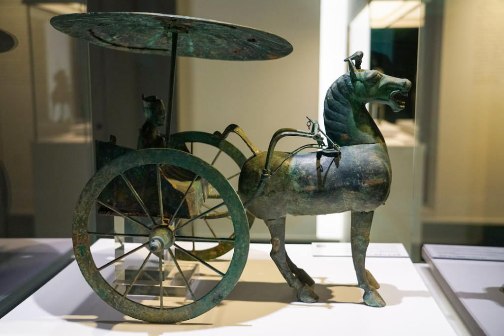 展厅里的“御奴驾马铜轺车”是仪仗队列前导车,御奴持缰坐于一侧,马匹矫健,还原汉代车马出行场景。这组展品既是汉代舆服制度的实证,也体现马在礼制社会中象征权力与秩序的文化内涵。