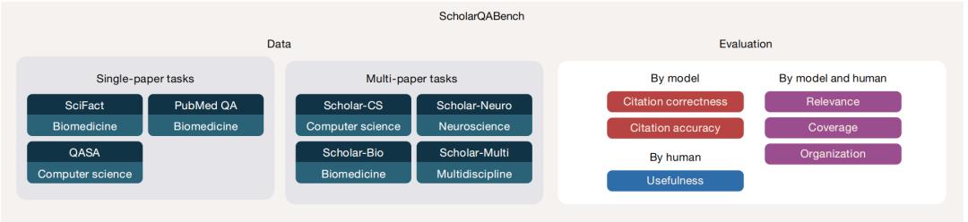 图 | ScholarQABench概览。该测试含2200道专家撰写的跨学科科学问题,研究团队开发了自动与人工评估方案。