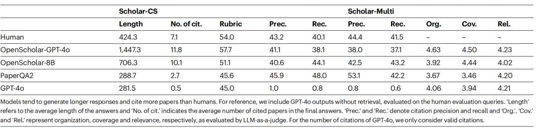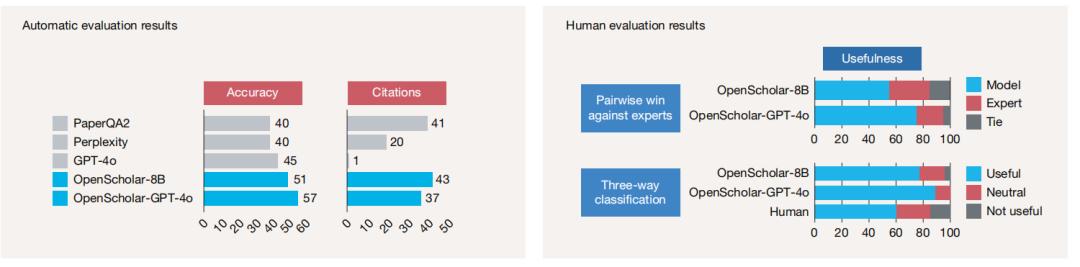 图 | 自动与人工评估结果:基于ScholarQABench计算机科学子集(Scholar-CS,100个问题)的实验数据显示,使用团队训练的8B模型或GPT-4o的OpenScholar系统表现显著优于其他系统,人工评估中超50%案例优于专家。本次人工评估由16位博士专家对Scholar-Multi的108个问题进行。