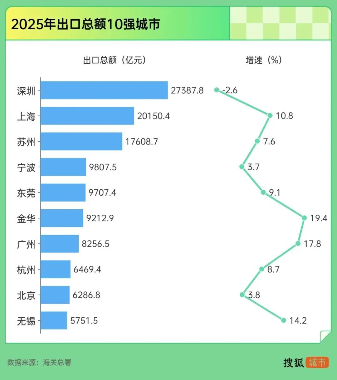 出口方面,宁波2025年出口额为9807.5亿元,增速仅3.7%,在出口十强城市中排名倒数第二,仅略好于深圳的负增长。