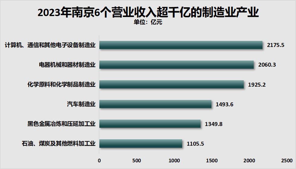 从千亿产业来看,2023年南京拥有6个营业收入超千亿的产业,分别是计算机、通信和其他电子设备制造业,电气机械和器材制造业,化学原料和化学制品制造业,汽车制造业,黑色金属冶炼和压延加工业,石油、煤炭及其他燃料加工业,其中计算机、通信和其他电子设备制造业营收最高。
