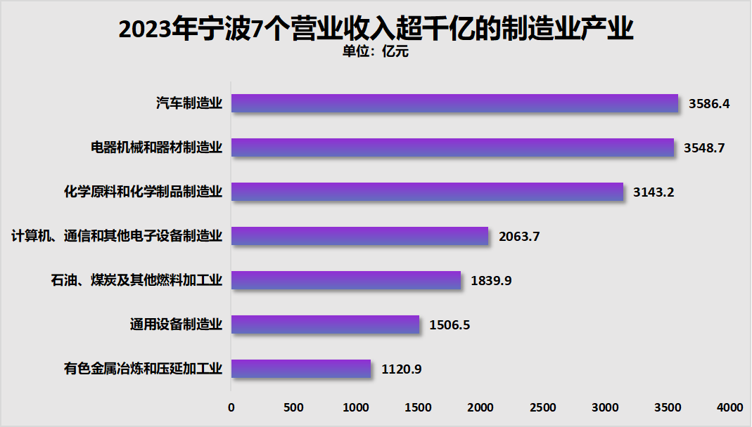 同期宁波拥有7个千亿产业,虽仅比南京多1个,但产业规模优势明显,宁波有3个营业收入超3000亿元的产业,汽车制造业是其核心产业。
