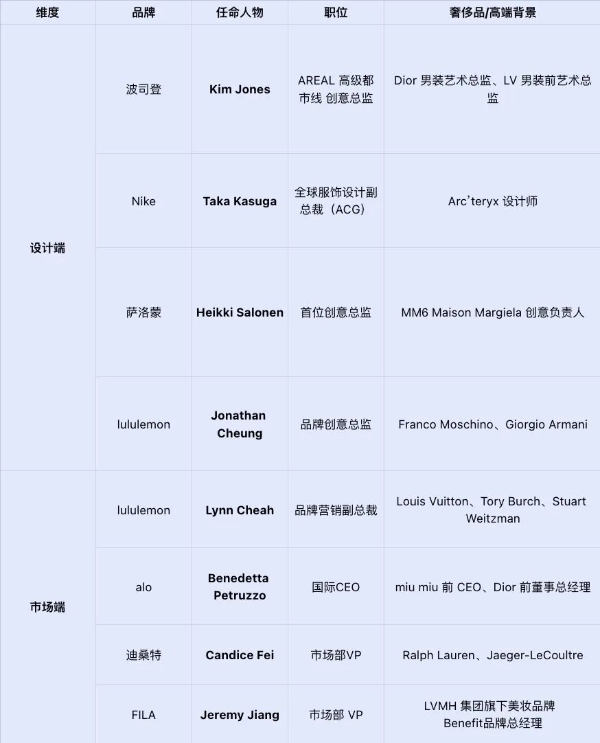 而奢侈品牌市场端的操盘手,能更直接地帮助高端运动品牌切入“奢侈品”营销的核心领域。