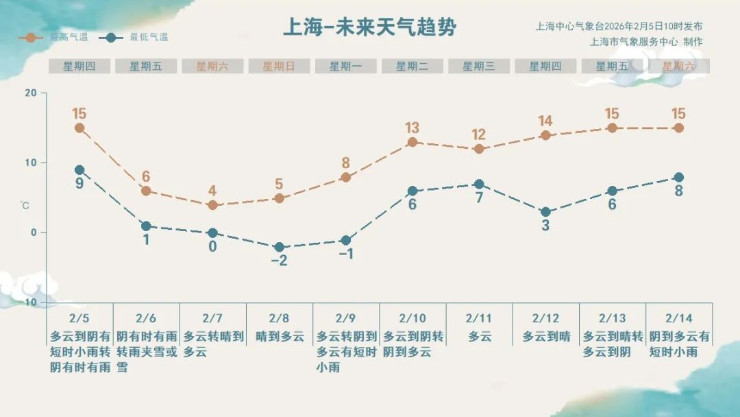 预计强冷空气会在明日(2月6日)凌晨开始影响上海,气温将显著下降,同时伴有大风。明日全天气温不足6℃,体感湿冷,需注意及时增添衣物保暖。白天大部分时间降水以降雨为主,明日傍晚起自北向南将有一次雨雪转换过程,主要为湿雪。市区会出现轻微积雪,西部和北部地区积雪厚度达1~3厘米。预计明日下半夜雨雪逐渐停止。明日夜间到周六上午上海部分区域可能出现道路结冰现象。明日雨雪转换时间恰逢下班高峰时段,道路会变得湿滑泥泞,降雪期间能见度降低,夜间还会有道路结冰情况,出行务必注意交通安全。