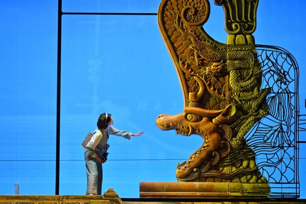 舞美设计王琛展示了其匠心独运的舞台构想:“图纸的流动性”成为核心设计理念——悬挂的测绘图纸既是对历史文献的具象呈现,更通过投影、折叠等手法,构建出时空交错的戏剧空间。在太和殿场景中,1:1复制的斗拱构件与线稿投影形成虚实对照,使观众既能直观感受古建结构,又能理解测绘工作的技术内涵。