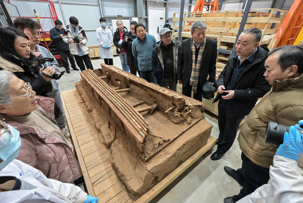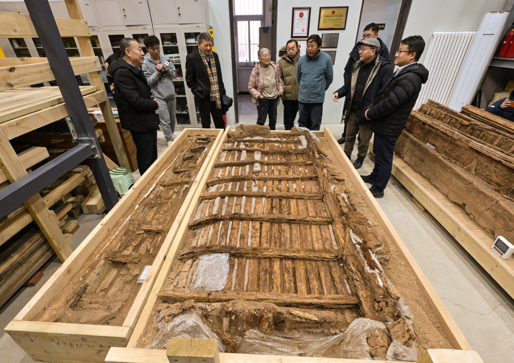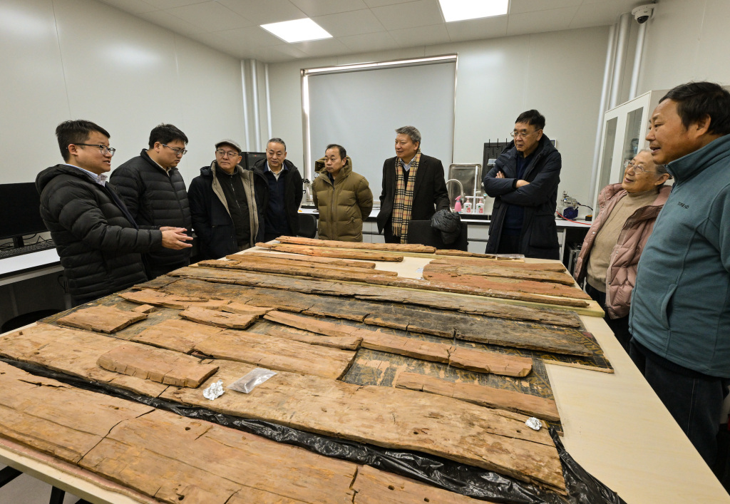 2026年2月5日,专家在实验室考古方舱内察看墓葬M20出土的完整木榻(2月1日摄)。新华社 图