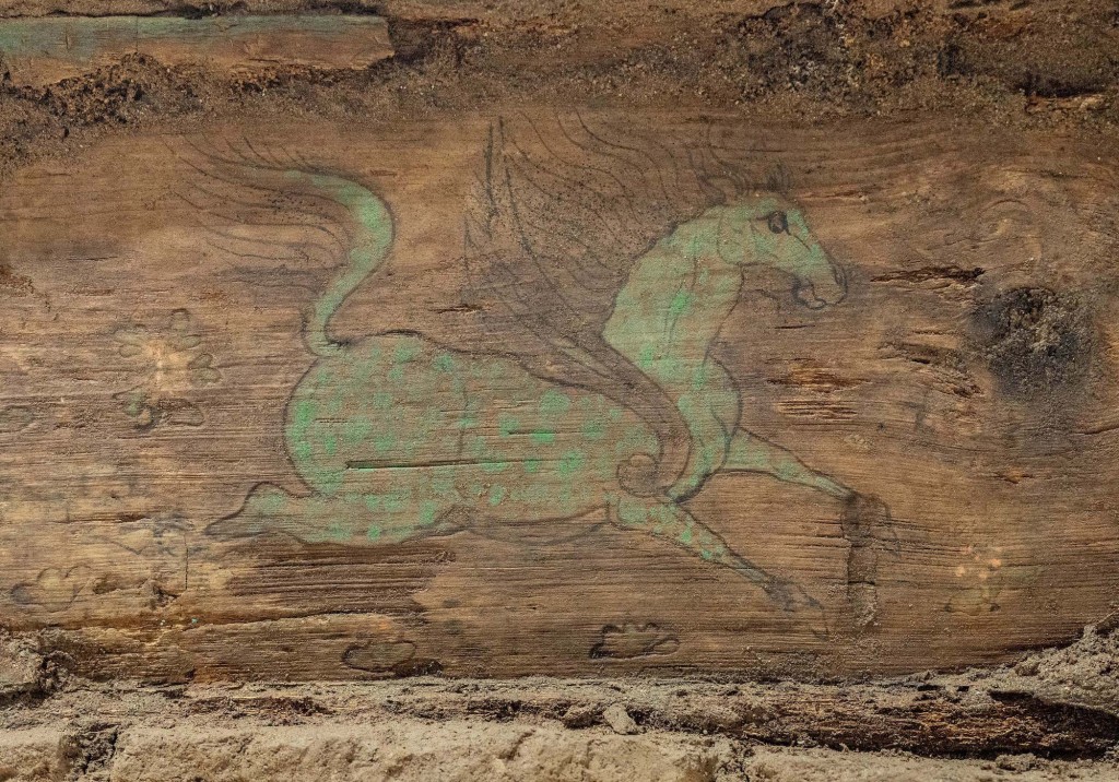 2026年2月5日公布的实验室考古方舱内拍摄资料(2月1日摄),展示了墓葬M20出土木棺座壸门内的彩绘“翼马”图案。新华社 图