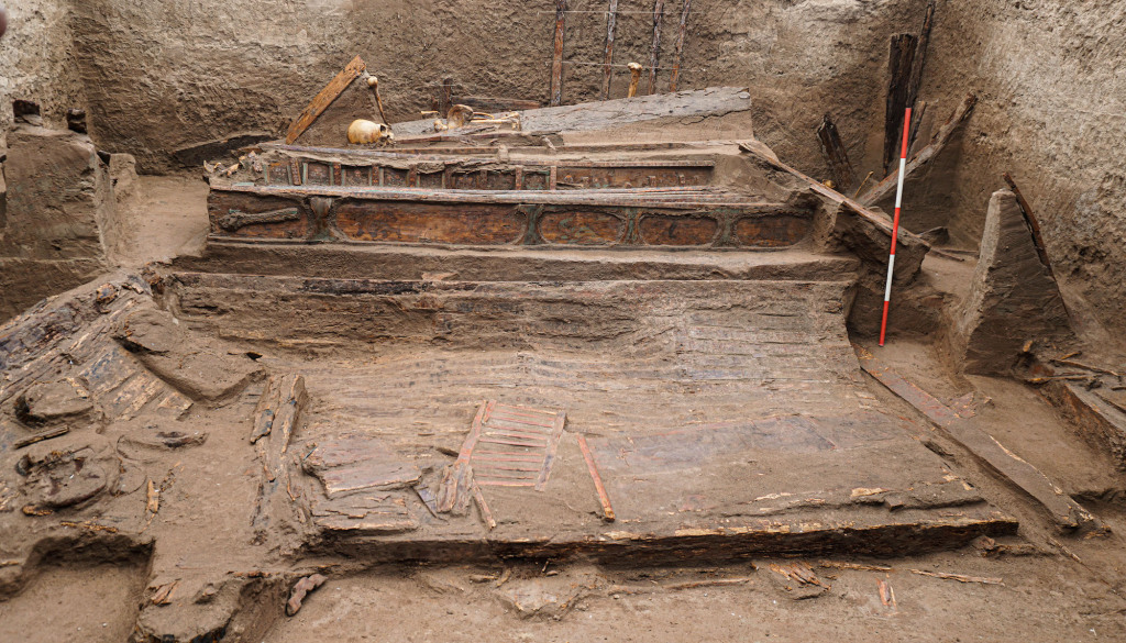 2026年2月5日公布的资料照片,展示了墓葬M20初步揭露时墓内木榻与彩棺的陈设布局。新华社 图