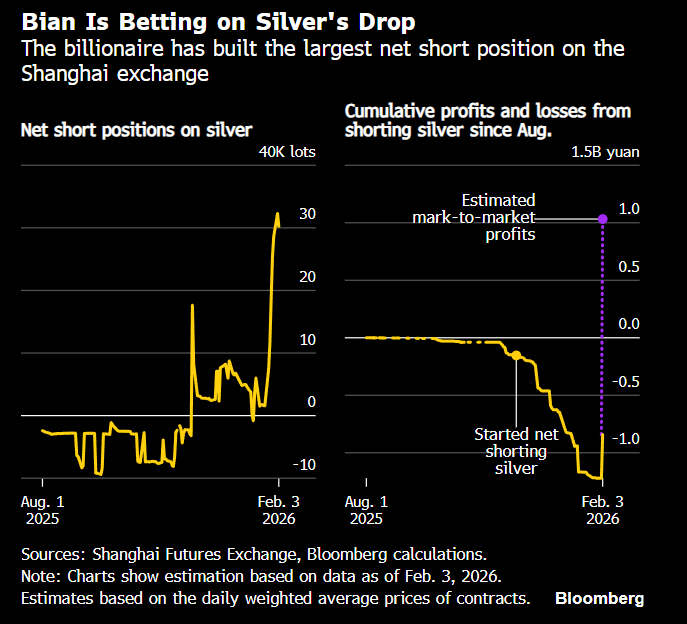 凭借精准把握金价创纪录上涨行情而声名鹊起的中国亿万富翁交易员边锡明,近期将投资目光转向波动剧烈的白银市场,目前持有价值近3亿美元的白银空单。