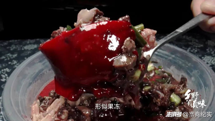 当老人把新鲜猪血拌入调料,直接端上餐桌;