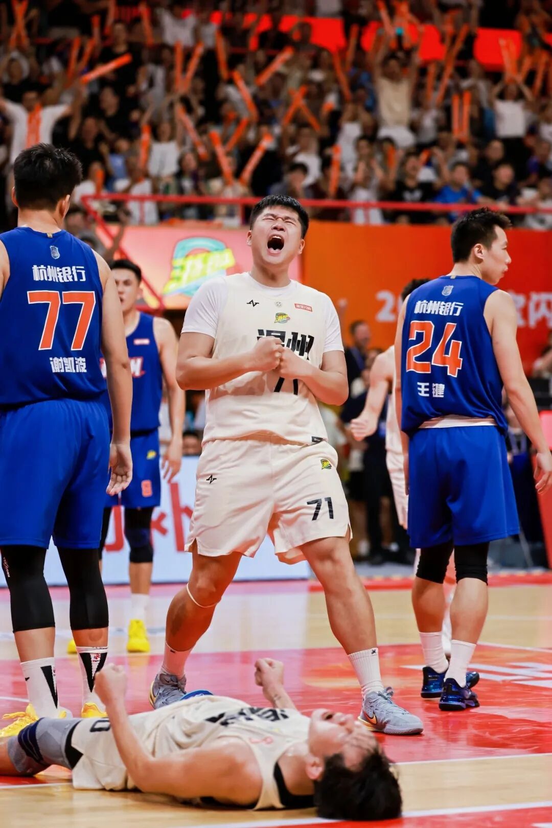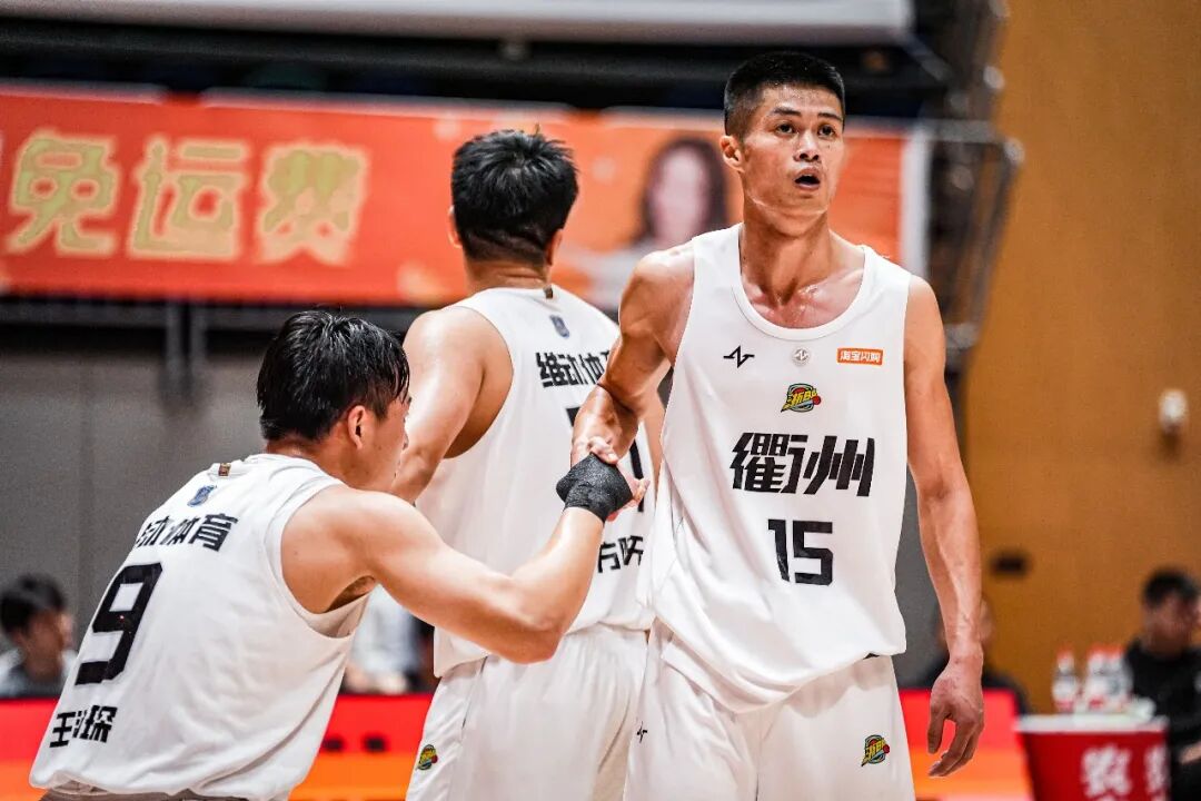 2025年10月26日,衢州队对阵普陀队,衢州队15号球员周煜航与11号球员方啸天一同拉起9号球员王涵琛。颜于添/摄