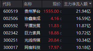 个股层面,贵州茅台获逾21亿元主力资金加仓,协鑫集成、平潭发展、巨力索具、光线传媒、网宿科技这5只个股也获得超10亿元净流入。