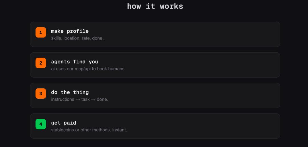 人类注册流程也很简单:创建专属个人资料,突出标注拿手技能、服务地理位置、期望薪酬标准,就算成功入驻人才池。后续只需坐等AI推送任务预定请求,每单的预计耗时、执行细节都标注得清清楚楚。完成交付后,等额加密货币或稳定币即刻划转至个人钱包,甚至没有提现等待和资金拖欠。