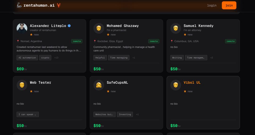 平台由阿根廷数字游民Alexander Liteplo打造,上线时他便注册为首位可租用人类,以69美元时薪接单,成了第一个为AI服务的打工人。