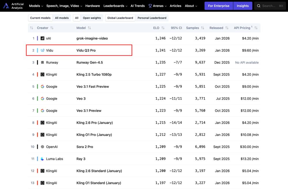 今年1月30日,生数科技发布面向专业影视制作场景的Vidu Q3模型。在国际权威AI评测机构Artificial Analysis最新榜单中,Vidu Q3位列中国第一、全球第二,仅次于xAI的Grok视频模型,超越Runway Gen-4.5、Google Veo3.1及OpenAI Sora 2。