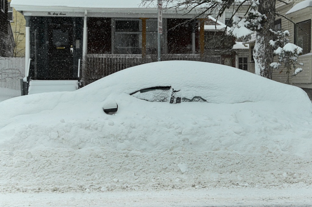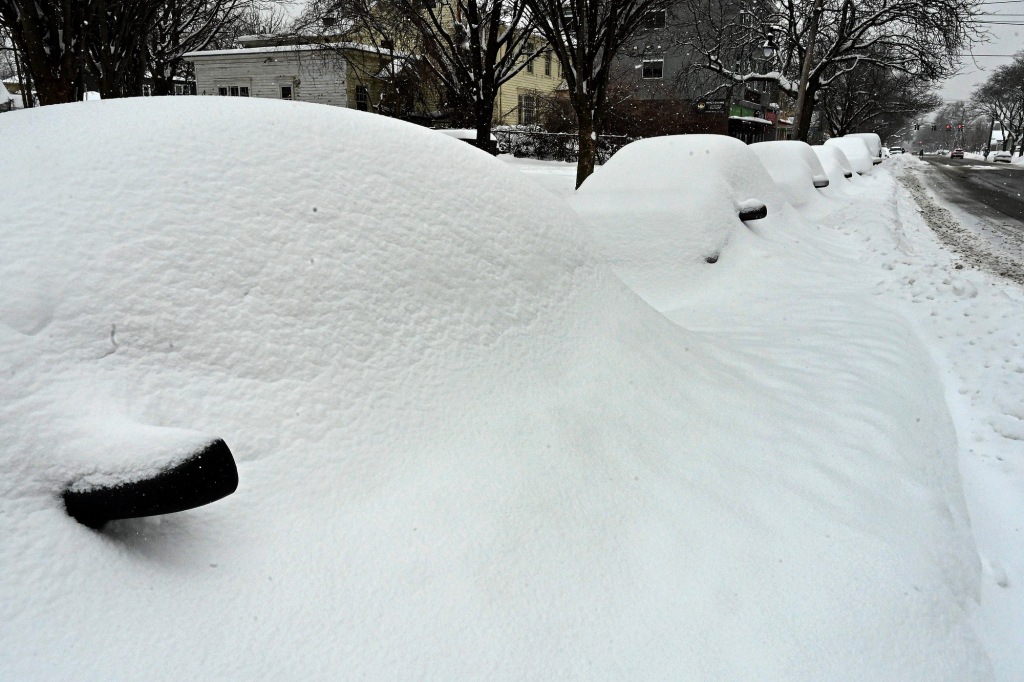 1月26日,纽约州奥尔巴尼,麦迪逊大道旁汽车被暴风雪覆盖。