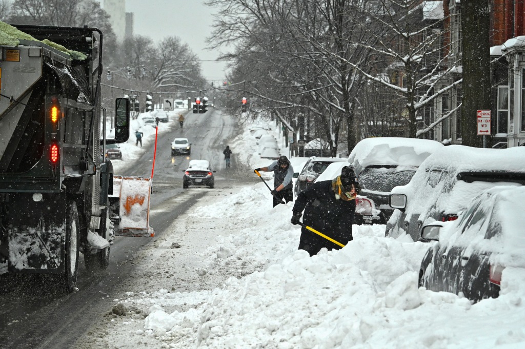 1月26日,纽约州奥尔巴尼,扫雪车行驶时人们清理被雪埋的汽车。