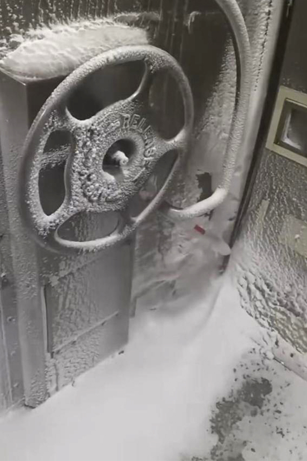 火车车厢内满是冰雪。
