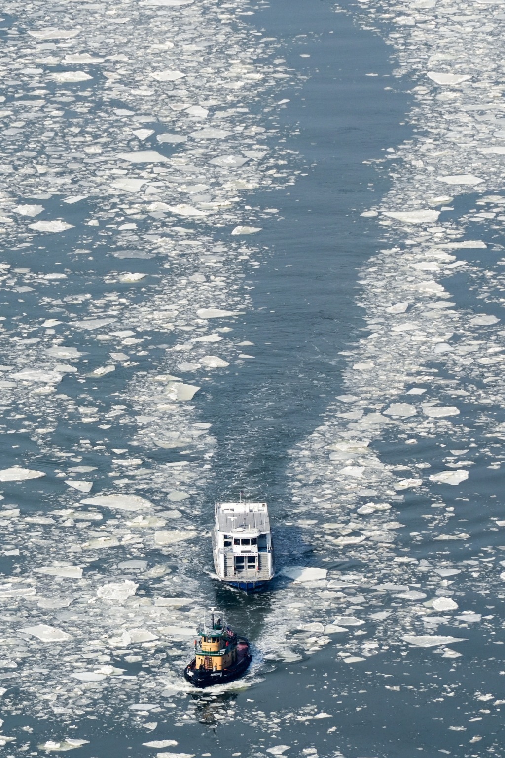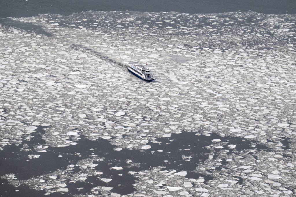 2月3日,船只在纽约哈得孙河的浮冰间航行。