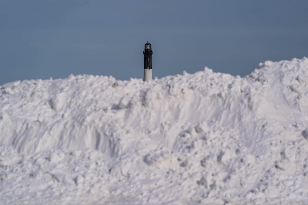 2026年2月1日,纽约州巴比伦,罗伯特·摩西州立公园大雪堆后的火岛灯塔。