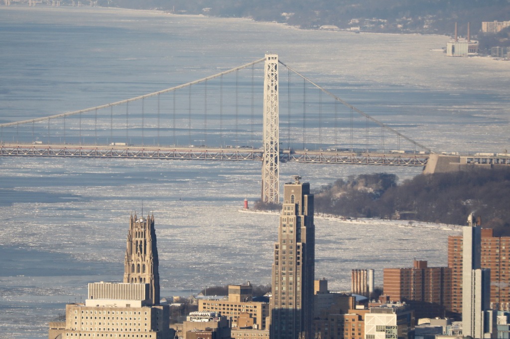 1月28日,纽约哈得孙河上漂浮着浮冰,远处自由女神像和韦拉扎诺海峡大桥依稀可见。
