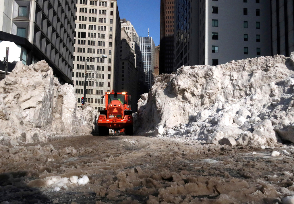 2月1日,纽约曼哈顿下城,挖掘机在“雪山”间工作。