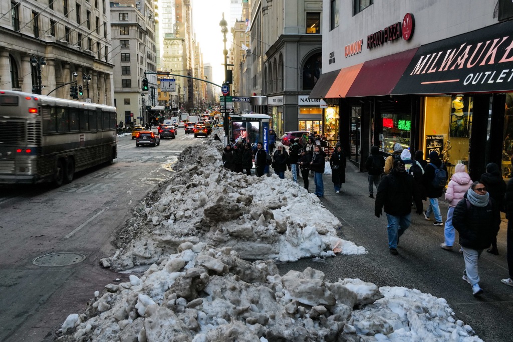 暴雪虽已停止,但持续低温让积雪难以融化,纽约部分区域积雪厚度仍达30厘米。这些积雪在街头留存超一周,封堵人行道阻碍行人通行,公交站台被厚雪覆盖,不仅影响公共出行,还拖慢应急救援节奏,给紧急处置增加难度。