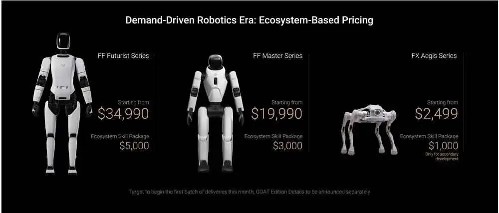 若能稳定交付并获得持续订单收入,FF有望成为美国首家交付人形机器人且实现正毛利的公司。此次发布的四款机器人涵盖人形与四足形态,定价从2499美元到34990美元不等,定位各有侧重。