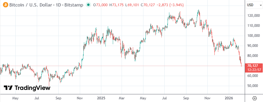 根据Bitstamp平台的行情数据,比特币在当日盘中最低下探至69101美元每枚,这是2024年11月7日之后的最低价格水平。从去年10月触及12.6万美元的历史峰值算起,比特币的累计跌幅已经达到40%。