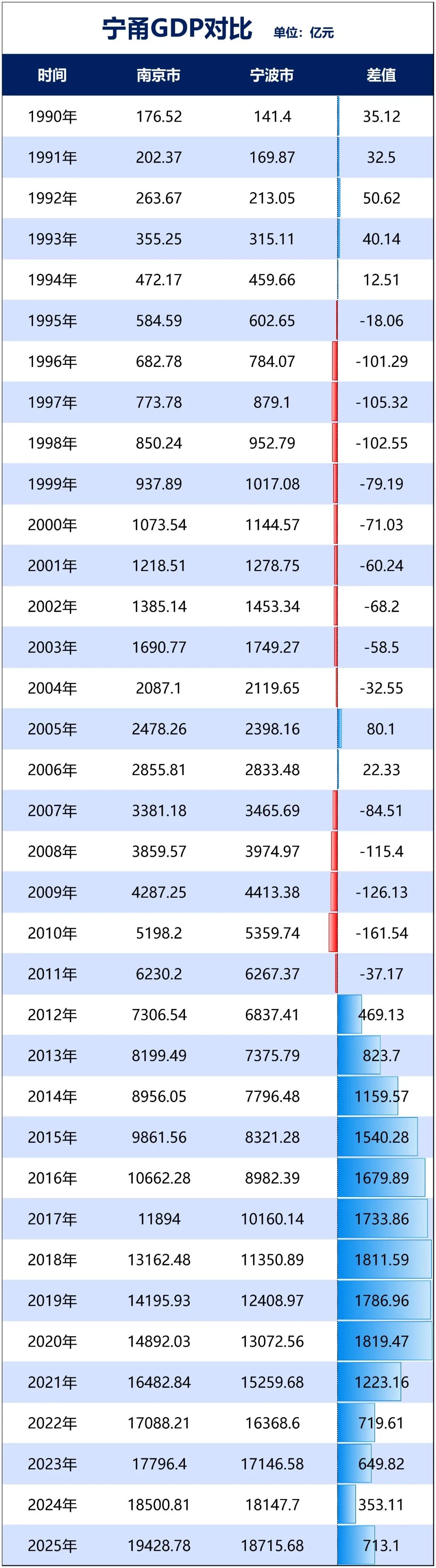 从两地历年统计年鉴的终核数据来看,南京与宁波曾多次交替领先。1995年宁波超越南京,领先优势持续至2010年,期间南京仅在2005年反超一次。2011年南京再度反超宁波,当时的大背景是2008年全球金融危机打乱沿海城市发展节奏,内陆省会城市借机崛起。2011年后南京领先优势不断扩大,2020年两者差距达1819.47亿元。2021年起南京发展放缓,宁波逐步缩小差距,2024年宁波仅落后南京353.11亿元,为2012年以来最小差距。但2025年南京再次将差距拉大到713.1亿元。