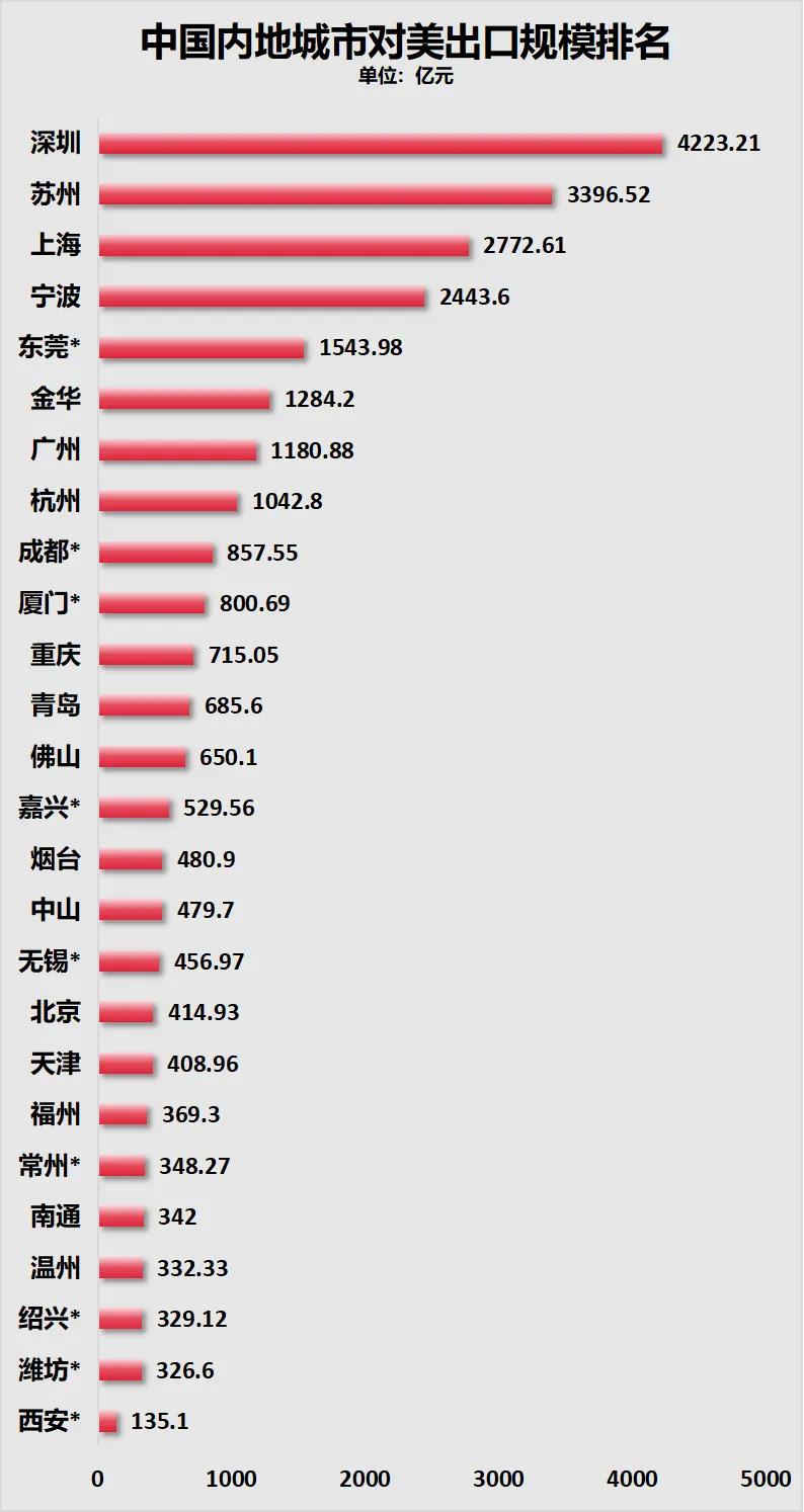 第一,从对美出口规模看,深圳、苏州、上海受影响最显著。